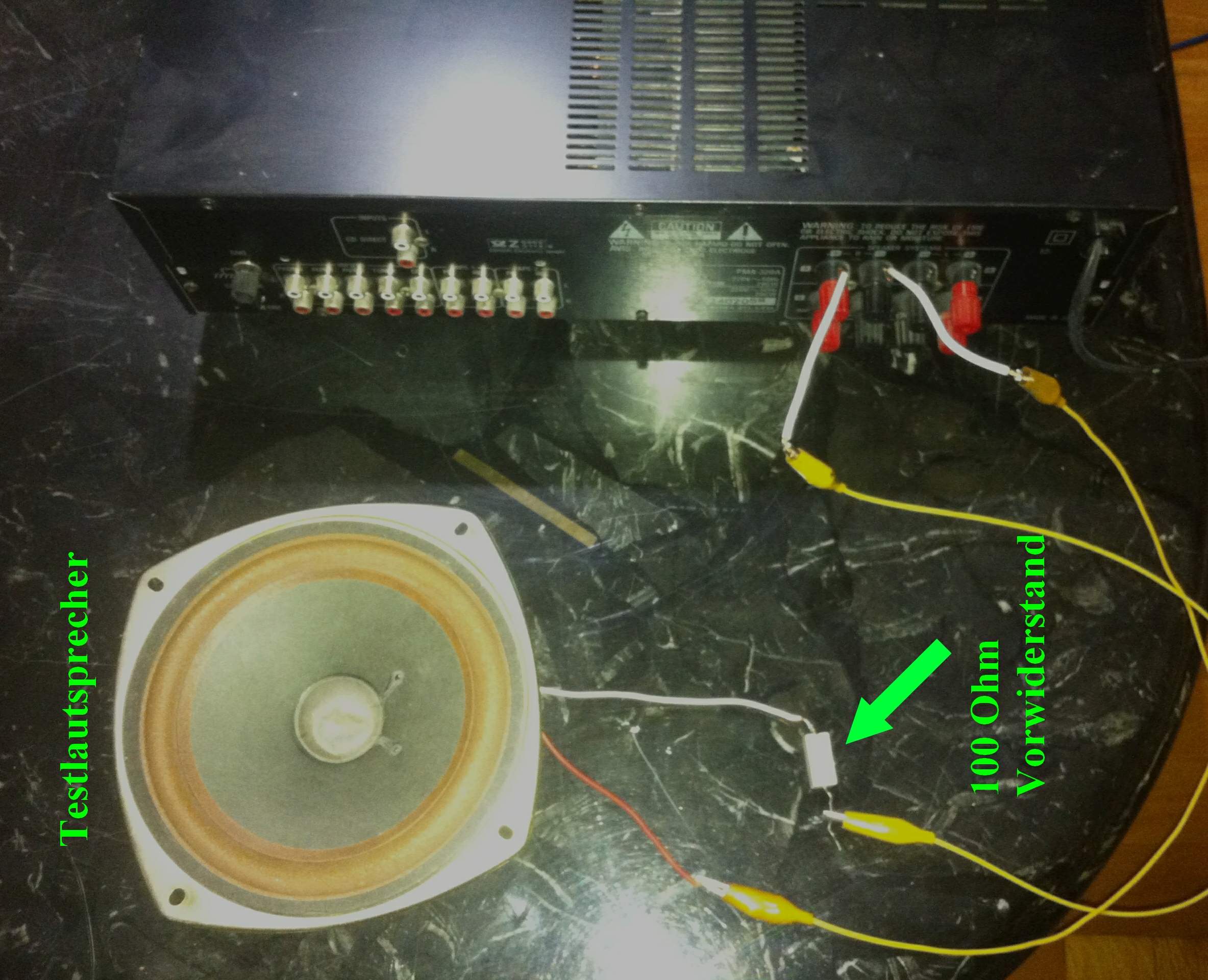 und einem 100 Ohm Vorwiderstand, um den Fehler selbst zu sehen und zu hören,