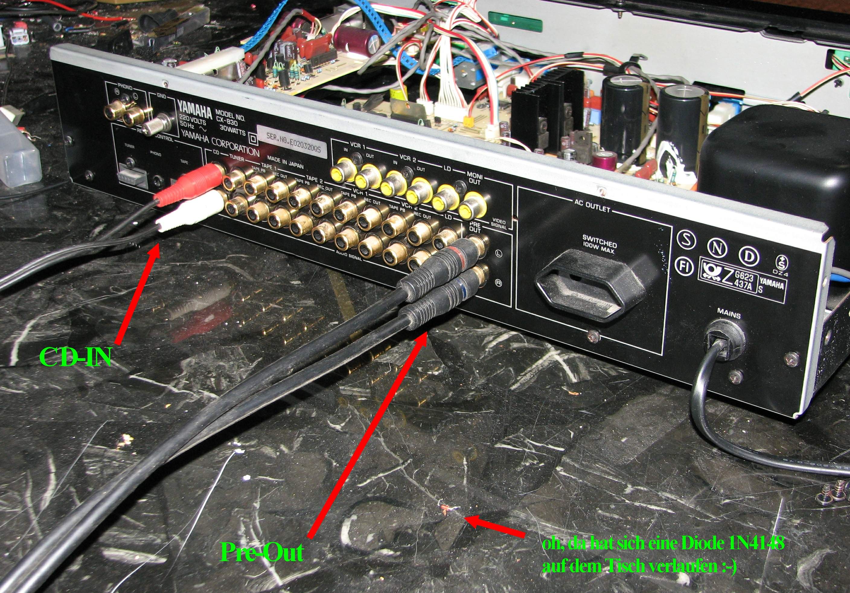 Jetzt noch die Sache mit dem Wackelkontakt des Pre-Out Ausgangs in Richtung Hauptverstärker.