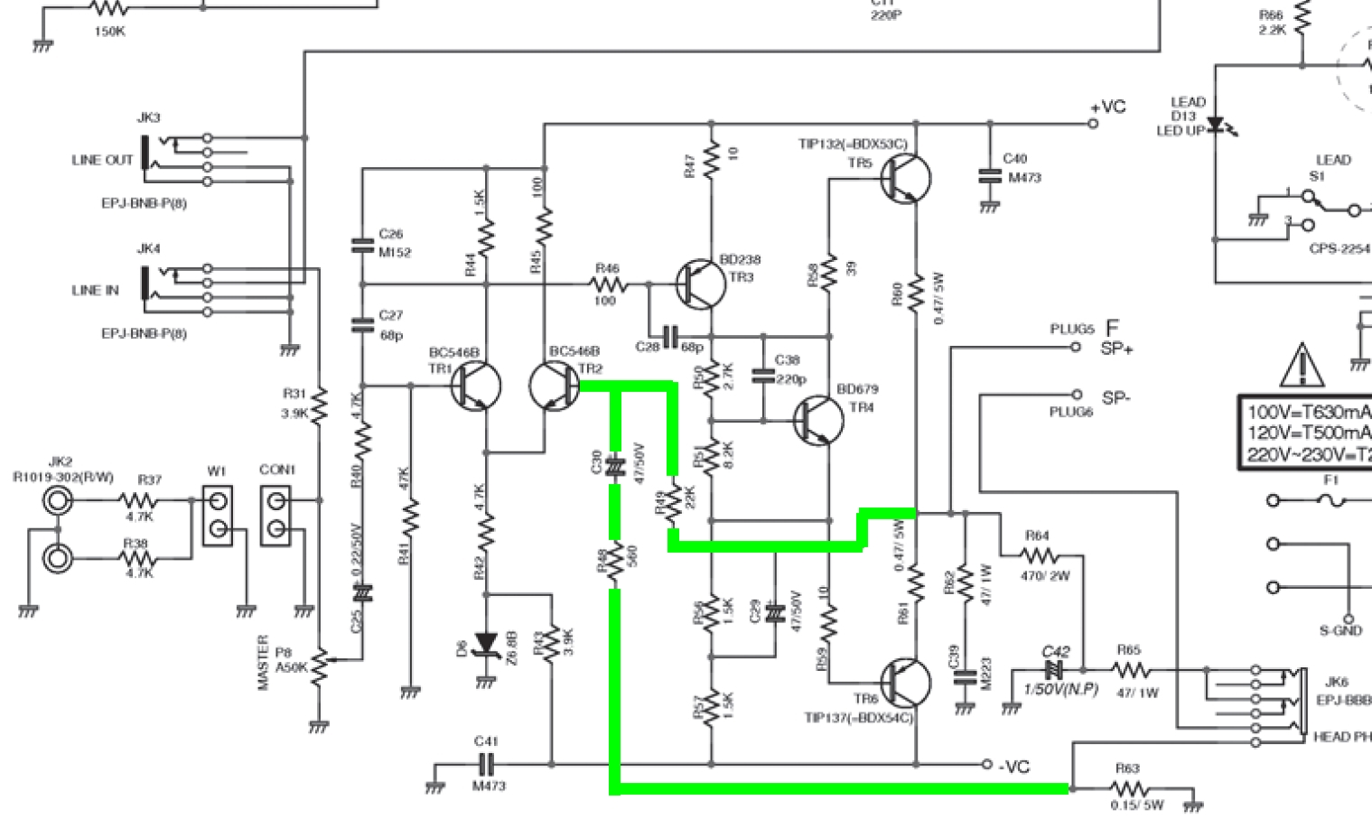 Also vom Lautsprecher-Ausgang zurück wandern.