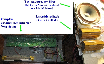 den Testlautsprecher (nicht im Bild) angeschlossen,